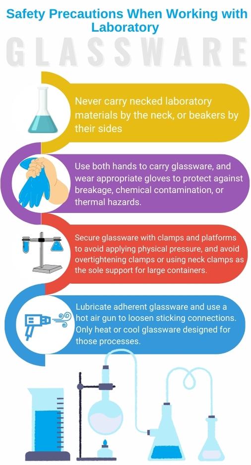 When working with laboratory glassware, there are some safety precautions everyone should take to avoid injuries. Here are some of them: